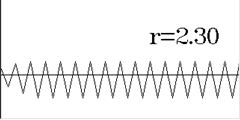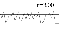 то состояние будет устойчивым, иначе мы вступаем в зону неустойчивостей, которая полна неожиданностями. В частности, при , (рис.3) возникают периодические колебания (рис.1). При картина усложняется и появляется двоякопериодические колебания (рис.2) При дальнейшем росте относительного коэффициента прироста, получаем учетверение периода и т.д., в случае наблюдаются хаотические колебания (рис.3).
