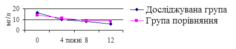 Через 12 тижнів лікування симвастатином спостерігалась значна позитивна динаміка з боку ліпідного профілю. 15 хворих (75%) досягли рекомендованого цільового рівня ЗХС <4,5 ммоль/л, 14(70%) – рекомендованого цільового рівня ХС ЛПВЩ (для жінок – >1,3 ммоль/л і чоловіків – >1 ммоль/л) та 15(75%) – рекомендованого цільового рівня ХС ЛПНЩ <2,6 ммоль/л. Слід зазначити, що на фоні лікування ефективність прийому 10-20 мг симвастатину проявлялася у достовірному зниженні рівня всіх ліпідних фракцій наприкінці 8 тижня, окрім ХС ЛПДНЩ, які достовірно змінились лише з 12 тижня.За нашою думкою, дане зниження показників ліпідного профілю наприкінці 8 тижня може бути критерієм ранньої ефективності препарату за період спостереження.