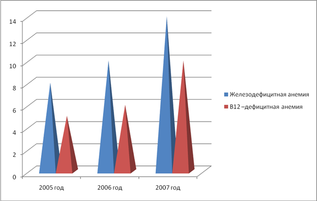 Из статистических данных наглядно видно, что число заболеваемости анемиями у детей младшего и среднего школьного возраста с каждым годом растет. Это связано с неосведомленностью родителей о правильном рациональном питании ребенка и позднем обращении их в лечебные учреждения, а также с неблагоприятными условиями как окружающей так и социальной среды. Данные также показывают что несмотря на рост заболеваемости уровень заболеваемости железодефицитной анемией выше, чем В12
