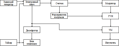Исходя из анализа современных устройств для лечебного и терапевтического воздействия была разработана структурная схема устройства, которая включает в себя следующие блоки: задающий генератор, электронный таймер реального времени, электронный ключ, дешифратор, формирователь импульсов, генератор управляемый напряжением (ГУН), усилитель мощности (УМ), счетчик, модулятор, блок индикации режима работы, излучатель.