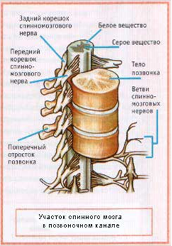 образуется в результате слияния переднего и заднего корешков, отходящих от спинного мозга. На заднем корешке расположено утолщение - спинномозговой узел, здесь находятся тела чувствительных нейронов. По отросткам чувствительных нейронов возбуждение проводится от рецепторов в спинной мозг. Передние корешки спинномозговых нервов образованы отростками двигательных нейронов, по которым передаются команды из центральной нервной системы к скелетным мышцам и внутренним органам. На уровне спинного мозга замыкаются рефлекторные дуги, обеспечивающие наиболее простые рефлекторные реакции, такие как сухожильные рефлексы (например, коленный рефлекс), сгибательные рефлексы при раздражении болевых рецепторов кожи, мышц и внутренних органов. Примером простейшего спинномозгового рефлекса может служить отдергивание руки при ее прикосновении к горячему предмету. С рефлекторной деятельностью спинного мозга связано поддержание позы, сохранение устойчивого положения тела при поворотах и наклонах головы, чередование сгибания и разгибания парных конечностей при ходьбе, беге и т.п. Кроме того, спинной мозг играет важную роль в регуляции деятельности внутренних органов, в частности, кишечника, мочевого пузыря, сосудов.