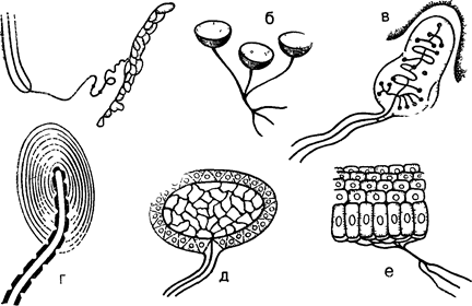 Мал. 3. Рецептори шкірної чутливості: а - тільця Руфіні, б - диски Меркеля, в - тільця Мейснера, г - тільця Пачіні, д - луковиця Краузе, е — вільне нервове закінчення