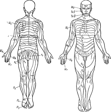 Мал. 5. Схема сегментарної чутливості шкіри людини.