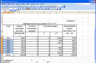 Уравнение прямой, выравнивающей ряд динамики будет иметь следующий вид: = 38477 + 215*t, т.е. в среднем с каждым годом объем выпуска продукции увеличивается на 215 тыс. руб.