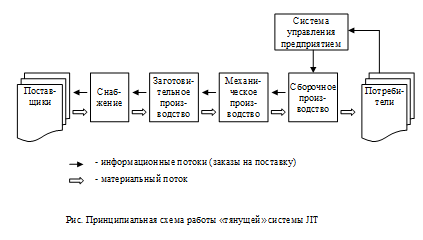 Логистические системы, использующие принципы концепции «точно в срок», являются «тянущими» системами (pullsystems), в которых размещение заказов на пополнение запасов материальных ресурсов или готовой продукции происходит, когда их количество достигает критического уровня. При этом запасы «вытягиваются» по логистическим цепям от поставщиков до потребителей. В концепции «точно в срок» ведущую роль играет спрос, определяющий дальнейшее движение ресурсов по всем каналам (рис.).