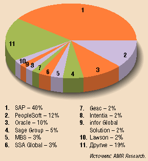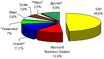 На российском рынке ERP-систем присутствует множество поставщиков: как иностранных, так и российских. По оценкам экспертов, основную долю рынка (свыше 48%) занимает немецкий вендор SAP AG, следом за ним идут продукты Microsoft Business Solution с долей около 13%, а замыкает тройку лидеров компания Oracle, занимающая чуть больше 11% российского рынка ERP-систем. Столь значительный отрыв SAP можно отчасти объяснить тем, что немецкий концерн первым вышел на российский рынок, открыв свое представительство еще в 1992 году. На мировом рынке ситуация несколько иная и основная борьба за лидерство разворачивается между SAP и Oracle.