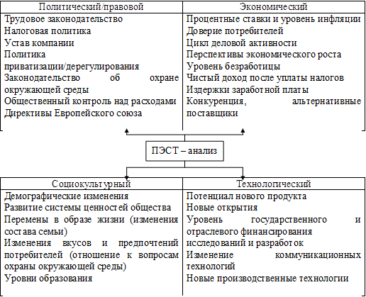 Анализ макроокружения включает изучение влияния экономики, правового регулирования и управления, политических процессов, природной среды и ресурсов, социальной и культурной составляющих общества, научно-технического и технологического развития общества, инфраструктуры и т.п.