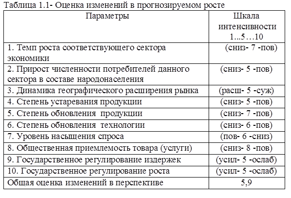 3) На третьем этапе осуществляется количественная оценка изменения факторов, определяющих перспективы роста в ближайшей и отдаленной перспективе. Для этого используется таблица бальной оценки важнейших факторов роста (таблица 1.1)