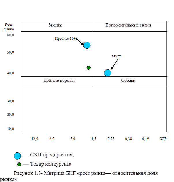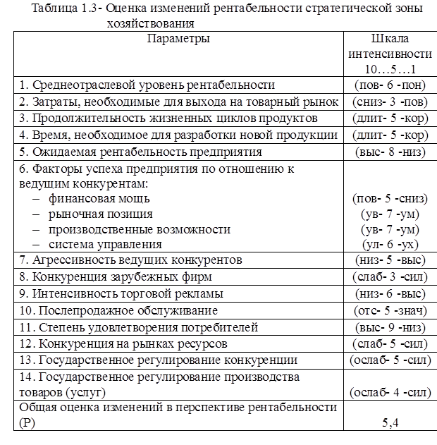 5) Следующий этап состоит в оценке перспектив рентабельности для СХП предприятия с учетом его маркетинговых преимуществ давления конкурентов. Эти данные вносятся в соответствующую таблицу 1.3.