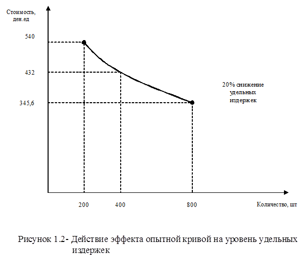 Практикой установлено, что диапазон этого снижения в зависимости от особенностей производства может колебаться от 10% до 30%. Чем более сложной и наукоемкой является продукция, тем выше эффект. На рисунке 1.2 рассмотрим действие эффекта опытной кривой на удельные издержки при показателе 20%. Предположим, что издержки на производство и сбыт составляют 540т. ден.ед. при общем объеме 200 единиц продукта. В этом случае удвоение объема производства и сбыта до 400 единиц приведут к снижению удельных издержек на 20% и составят 432т. ден.ед. Последующее удвоение до 800 единиц снова повлечет снижение уровня удельных издержек на 20%, и они составят уже 345,6т. ден.ед. и т.д. Таким образом, предприятие, достигающее удвоения объемов производства и сбыта своей продукции, получает дополнительные преимущества в конкуренции на основе относительной экономии издержек при том же качестве товаров.