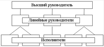 Линейная структура (рис.8) - делением организации по вертикали сверху вниз и непосредственной подчиненностью низшего звена управления высшему по всем вопросам. Руководитель наделен всеми полномочиями и осуществляет единоличное руководство подчиненными ему работниками, несет полную ответственность за результаты деятельности подчиненных ему подразделений.