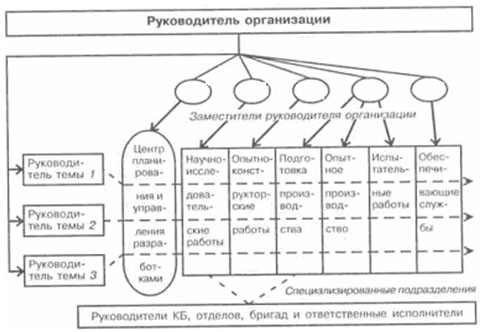 В одну команду собираются квалифицированные специалисты разных профессий для производства работ заданного качества в рамках материальных, финансовых и трудовых ресурсов. Проектные структуры различаются по масштабу, широте охвата проблем и отраслей знаний и производства, по характеру взаимодействия с линейными и функциональными звеньями организации. Члены проектной команды подчиняются не только руководителю проекта, но и руководителям тех функциональных подразделений, в которых они постоянно работают. Разновидностью являются матричные структуры (рис.14).