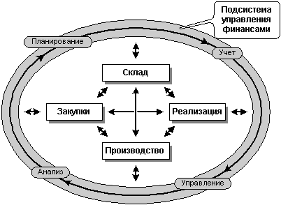 Обратите внимание: модули автоматизации управления закупками, складами, производством и реализацией имеют двунаправленные информационные связи с подсистемой управления финансами, обеспечивающей планирование, учет, управление и анализ данных.