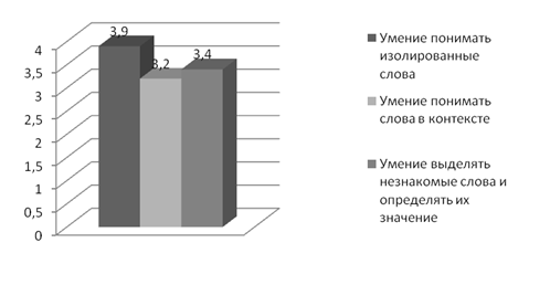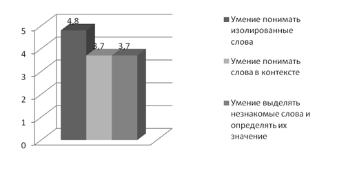 По прежнему у студентов возникают трудности с пониманием слов в контексте, но следует отметить повышение показателей уровня этого умения (средний балл исходной диагностики – 3,2; средний балл итоговой – 3,7). Повысился уровень понимания незнакомых слов (в исходной диагностике он был равен 3,4, в итоговой – 3,7). У всех студентов отмечается положительная тенденция в развитии уровня лексических умений аудирования: лучшие результаты показали Линикова О. и Пальчиков В.