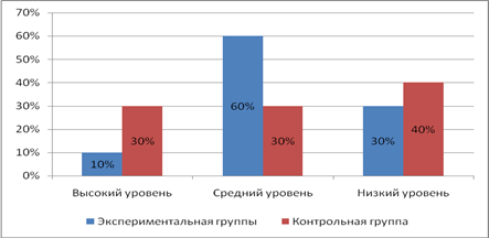 Анализ теоретических положений и методических выводов позволил представить результаты опытно-экспериментальной работы. При прочих равных условиях на начальном этапе формирования эксперимента уровень развития детей в контрольной группе был выше, чем в экспериментальной. Анализ результатов экспериментальной группы до и после формирующего эксперимента свидетельствует об эффективности разработанного нами комплекса методов и приемов. Экспериментальная группа улучшила свои результаты. Процент детей с низким уровнем развития уменьшился на 30%. Соответственно количество детей со средним и высоким уровнем развития также увеличился.