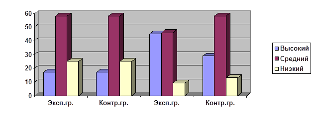 В результате сравнительного анализа диагностических данных видно, что перед началом эксперимента в обеих группах высокий уровень развития составил 17%, средний – 58%, а низкий – 25%.(Приложение № 1, 2)