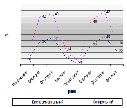 В експериментальному класі кількість учнів, що виконали завдання на високий рівень становить 22%, що на 8% більше, ніж у контрольному класі, а на достатній рівень у експериментальному класі виконали завдання на 4% більше, ніж у контрольному класі. На середній рівень у експериментальному класі виконали завдання на 8% менше, ніж у контрольному.