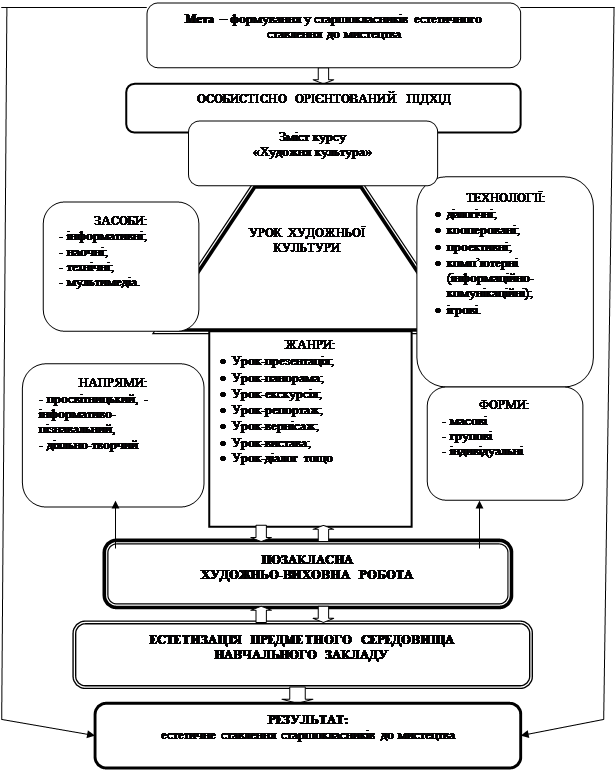 – здійснювати формування у старшокласників естетичного ставлення до мистецтва системно у зв’язку уроків художньої культури, позакласної художньо-виховної роботи та естетизації предметного середовища навчального закладу.
