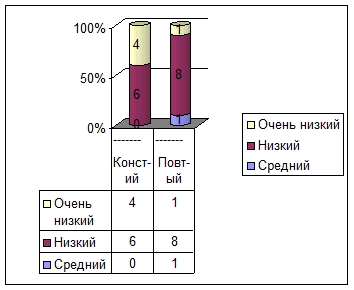Из таблицы видно, что на очень низком уровне развития наглядно-образного мышления находятся 1 ребенок, на низком – 4 и на среднем всего 5 исследуемых детей.