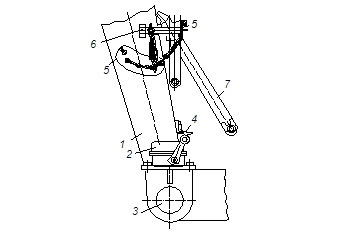 1 — стрела (башня); 2 — конечный выключатель; 3 — пята крепления стрелы (башни); 4 — упор конечного выключателя; 5 — шкала указателя грузоподъемности; 6 — стрелка; 7 — упор от переброски назад стрелы (башни).