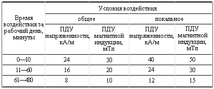 ПДУ напряженности (индукции) ПМП на рабочих местах представлены в табл. 1.