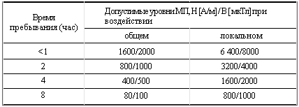 Оценка и нормирование ПМП осуществляется по уровню магнитного поля дифференцированно в зависимости от времени его воздействия на работника за смену для условий общего (на все тело) и локального (кисти рук, предплечье) воздействия .