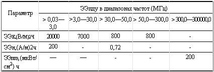 Таблица 4. ПДУ энергетических экспозиций ЭМП диапазона частот > 30 кГц—300 ГГц