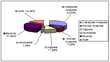 Распределение пожаров по континентам планеты в относительных показателях приведено на рис.4.1.1.