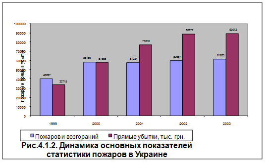 Согласно данных международной статистики, при возрастании численности населения на 1% количество пожаров увеличивается приблизительно на 5%, а убытки от них возрастают на 10%. По данным, которые поступили в УкрНИИПБ МЧС Украины от ГУ(У) МЧС Украины в областях, АР Крым, городах Киеве и Севастополе, за 12 месяцев 2003 года в стране зарегистрировано 61тыс. 280 пожаров и возгораний.