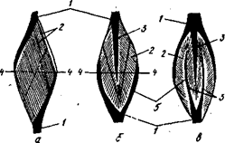 двуперистая; в — многоперистая; 1 — сухожилия мышц; 2 —