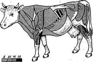 Рис. 3. Топография мышц различной структуры (по В. М. Сысоеву): Д — динамические; ДС — динамостатические; ПС — полустатические; СД— статодинамические.