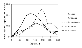 По скорости радиального роста все изученные виды можно условно разделить на три основные группы: 1) виды с наивысшей скоростью роста – Ulocladium consortiale и Alternariaalternatа; 2) вид Cladosporium sphaerospermum, скорость роста которого была наиболее низкой; 3) остальные изученные виды занимали промежуточное положение по этому параметру (Блажеевская, 2002).
