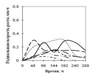 Характер и продолжительность ростовых ритмов, так же как и радиальная скорость роста, зависят от систематического положения гриба, его возраста (возраста культуры), концентрации в среде основных источников питания и энергии, а также других экологических факторов (Романов, 1980; Бухало, 1988). Ритмы грибов варьируют от 4 – 5 часов до 7 – 9 суток, нескольких недель и даже лет (Шаркова, 1971).