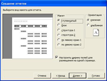 Далее определим вид макета (ступенчатый), ориентацию (альбомная) и поставим галочку в окне Настроить ширину полей для размещения на одной странице (