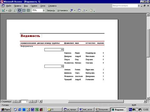 · отчетов, предназначенных для просмотра и вывода на печать данных из базы и результатов их обработки в удобном для пользователя виде.