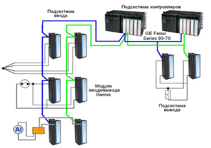 С полевых датчиков значения поступают в подсистему ввода, состоящую из модулей Genius. Подсистема ввода передает полученные значения в подсистему контроллеров. Контроллеры обрабатывают данные и отсылают значения в подсистему вывода, которая выдает управляющие сигналы на исполнительные устройства.