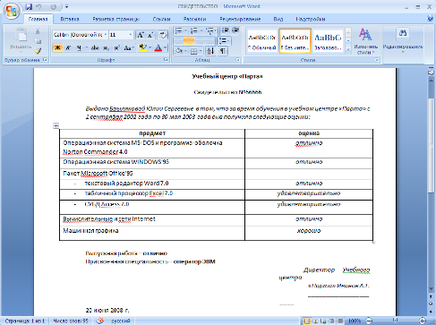 Выдано Гороховой Ирине Павловне в том, что за время обучения в учебном центре «Парта» с 1 сентября 2002 года по 30 мая 2003 года она получила следующие оценки:
