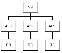 SIMD (single instruction stream / multiple data stream) (рис. 1.2) - одиночный поток команд и множественный поток данных. В архитектурах подобного рода сохраняется один поток команд, включающий, в отличие от предыдущего класса, векторные команды. Это позволяет выполнять одну арифметическую операцию сразу над многими данными - элементами вектора. Способ выполнения векторных операций не оговаривается, поэтому обработка элементов вектора может производится либо процессорной матрицей, как в ILLIAC IV, либо с помощью конвейера, как, например, в машине CRAY-1.