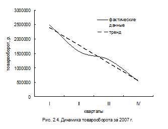 Из вышеприведенного анализа можно сделать вывод о том, что деятельность ООО «БРВ – Краснодар» нельзя назвать достаточно эффективной. Об этом свидетельствуют и данные таблицы 2.2.5., характеризующие состояние организации как неустойчивое, и данные таблицы 2.4.2., которые показывают, что прибыль от продаж и рентабельность продаж за 2006¾2007 гг. сократились соответственно на 14,4% и 0,78%, и данные графика 2.4., иллюстрирующего снижение объема товарооборота за 2007 год.