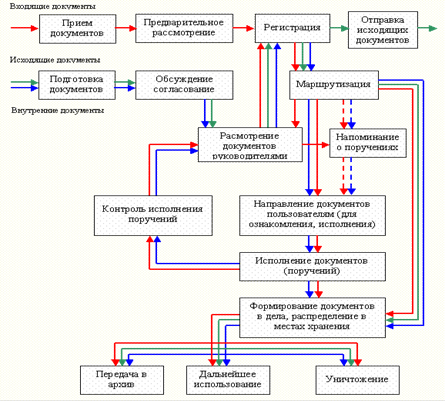На схеме 1 рассматривается порядок работы с входящими, исходящими и внутренними документами. Организация работы с входящими документами (отмеч. Красными стрелками) начинается с приема документов, предварительным просмотром, затем регистрацией, рассмотрением документов руководителями, далее направлением документов пользователям для ознакомления и исполнения, далее организовывается контроль над исполнением поручений, а следом документы формируются в дела и распределяются в местах хранения, и в заключении документы либо передаются в архив, либо уничтожаются, либо ими пользуются дальше.