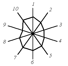 Рис. 3.1 - общее впечатление; 2 - соленый вкус; 3- кисловатый вкус; 4 - острый вкус; 5 - щелочной вкус; 6 - порочащий вкус; 7 - едкий вкус; 8 - щиплющий вкус; 9 - сладковатый вкус; 10 - горьковатый вкус.
