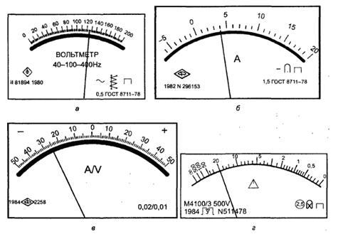 Рис. 1. Лицевые панели приборов: а) вольтметра класса точности 0,5; б) амперметра класса точности 1,5; в) амперметра класса точности 0,02/0,01; г) мегомметра класса точности ( ) с неравномерной шкалой