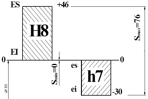 = 0,076 – 0 = 0,046 + 0,030 = 0,076 мм.