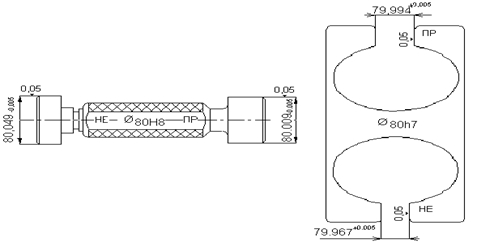 Отвір Æ80Н7. Нижнє відхилення отвору ЕІ = 0. Найменший діаметр отвору буде D = D + EI = 80 + 0 = 80 мм; верхнє відхилення отвору, ЕS = +30 мкм; найбільший діаметр отвору буде D = D + ES = 80,0 + 0,030 = =80,030 мм.