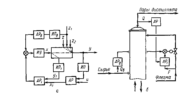 Так при регулировании состава паров дистиллята, отводимых из верха колонны (регулятор АР) для повышения качества регулирования используют быстродействующий стабилизирующий контур регулирования расхода флегмы в колонну (регулятор AP1), а также контур регулирования по возмущению (регулятор АРВ), учитывающий изменение состава сырья, поступающего в колонну (рис. IV-17,б).