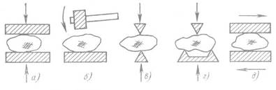 1) раздавливание (рисунок 1.2, а). Кусок материала зажимается между двумя поверхностями и раздавливается при сравнительно медленном нарастании давления;
