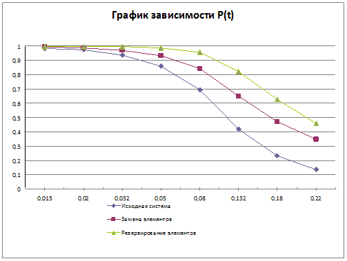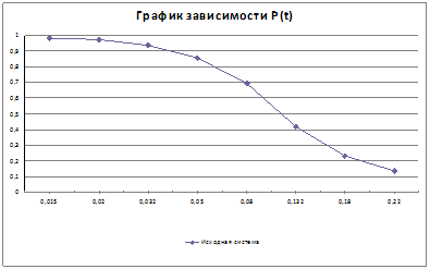 График изменения вероятности безотказной работы системы от времени наработки до уровня 0,1-0,2 для данной системы выглядит следующим образом: