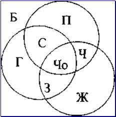 Рисунок 1 – Розміщення растрових елементів на кольоровому відбитку при автотипному способі друку трьома фарбами: елементи Ж – жовтої, П – пурпурної, Г – голубої фарб; кольори суміщень С – синій, 3 – зелений, Ч – червоний, Чо – чорний; Б – білий колір ділянок, на яких відсутні друкарські елементи