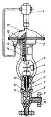 Рисунок 3.7 – Клапан мембранный регулирующий с позиционным релеУКН-ВО: 1–позиционное реле; 2– корпус мембранного механизма; 3–указатель положения; 4 –шкала; 5–набивка сальника; 6 –лубрикатор; 7 – корпус сальника; 8 – корпус клапана регулирующего; 9 – седло; 10 – фланец; 11 –затвор; 12 – обтюратор; 13 – шток; 14 –регулирующий упор; 15 – пружина; 16– мембрана; 17 – крышка мембранного механизма
