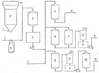 3) поверхностные воды с относительно большим количеством взвешенных веществ (на рис. обозначены 1в), освобождаются от них в осветление, после чего подвергаются механическому фильтрованию и далее комбинируются с одной из схем ионообменного фильтрования. При этом часто. В целях разгрузки ионообменной части водоподготовительной установки, одновременно с коагуляцией осуществляют в осветлителе частичное умягчение воды и снижение ее солесодержание путем известкования и магнезиального обескремнивания. Такие комбинированные схемы особенно целесообразны при обработки сильно минерализованных вод, поскольку даже при частичном их обессоливании методом ионного обмена требуются большие